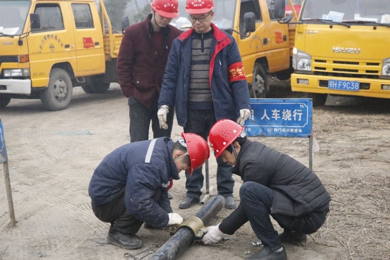 接到電話“報警”后,維修公司第一時間派隊員趕往現(xiàn)場查看情況,并根據(jù)反饋情況及時安排部署搶修方案。因冰凍天氣下行車不安全,所有出動車輛需要安裝防滑鏈,搶修人員、搶修物資在短時間內(nèi)迅速集結(jié)到位。通過供水設(shè)施管理部確認(rèn)完成關(guān)閥停水后,搶修人員立即按照應(yīng)急預(yù)案步驟,有條不紊地開展管道搶修工序,經(jīng)過30分鐘的快速作業(yè),應(yīng)急搶修任務(wù)順利完成。