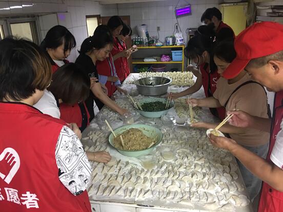 大家各司其職,有的擇菜、洗菜,有的剁餡、和餡,有的包餃子、煮餃子,有的打掃衛(wèi)生,有的陪老人拉家常,了解他們的飲食起居。大家邊聊天邊干活,院里笑聲不斷、其樂融融。