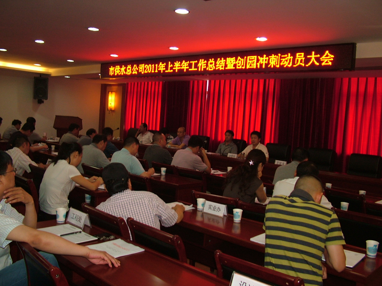 7月6日,市供水總公司在六樓會(huì)議室召開2011年上半年工作總結(jié)暨創(chuàng)園沖刺動(dòng)員大會(huì)。公司中層以上干部和全體機(jī)關(guān)人員參加會(huì)議,會(huì)議由黨委書記、副總經(jīng)理陳永根主持,會(huì)議內(nèi)容豐富而緊湊。黨群辦主任馬兆芳傳達(dá)了住建委創(chuàng)園沖刺動(dòng)員大會(huì)精神;陳書記部署了創(chuàng)建國家園林城市工作和人大評議工作;副總經(jīng)理郭林舫部署了安全生產(chǎn)工作;黨委副書記、工會(huì)主席徐黎明傳達(dá)了綜合整治會(huì)議精神;總經(jīng)理陳衛(wèi)國對上半年工作作了總結(jié),對下半年工作作了安排,傳達(dá)了市委從嚴(yán)管理干部的意見精神,對公司創(chuàng)優(yōu)發(fā)展環(huán)境,整治“庸懶散”專項(xiàng)治理活動(dòng)進(jìn)行了動(dòng)員安排,要求全體干部職工提振精神、腳踏實(shí)地、創(chuàng)先爭優(yōu)、統(tǒng)籌兼顧,為出色完成全年目標(biāo)任務(wù)和各項(xiàng)重點(diǎn)工作,推動(dòng)供水工作上新臺(tái)階而努力奮斗!