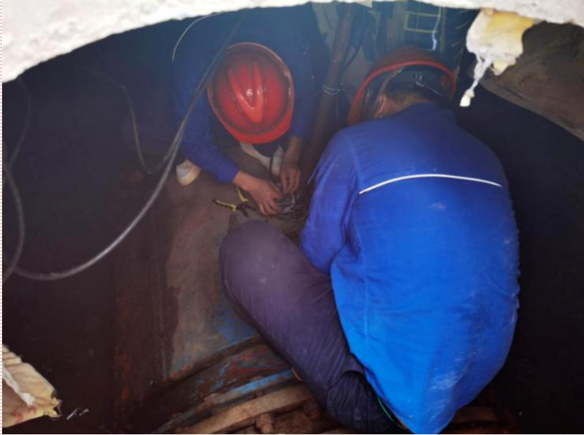 廠領(lǐng)導(dǎo)在綜合評估后,同意其思路,并作安全操作提醒。雖早有心理準(zhǔn)備,但在打開接線盒后的瞬間,李為龍等人還是倒吸一口涼氣。他們發(fā)現(xiàn)整個接線盒內(nèi)部被深色不透明的膠體充滿,無法掌握線路走向。短暫思索后,他們發(fā)揮水務(wù)人不怕苦、能戰(zhàn)斗的精神,嘗試按廠家給出建議,用熱風(fēng)槍加熱密封膠,但事與愿違,效果并不理想,密封膠沒有自動融化流出。李為龍“改巧為笨”,在加熱的同時用小刀清理變軟的膠體。該處操作空間狹小,且不能損壞內(nèi)部的線路和接線端子,必須凝神聚力,是個“精細活”“體力活”。即便同事們輪番上陣,依然個個汗如雨下。功夫不負有心人,眾人合力熬過“漫長的”4小時,最終完成了既定任務(wù)。