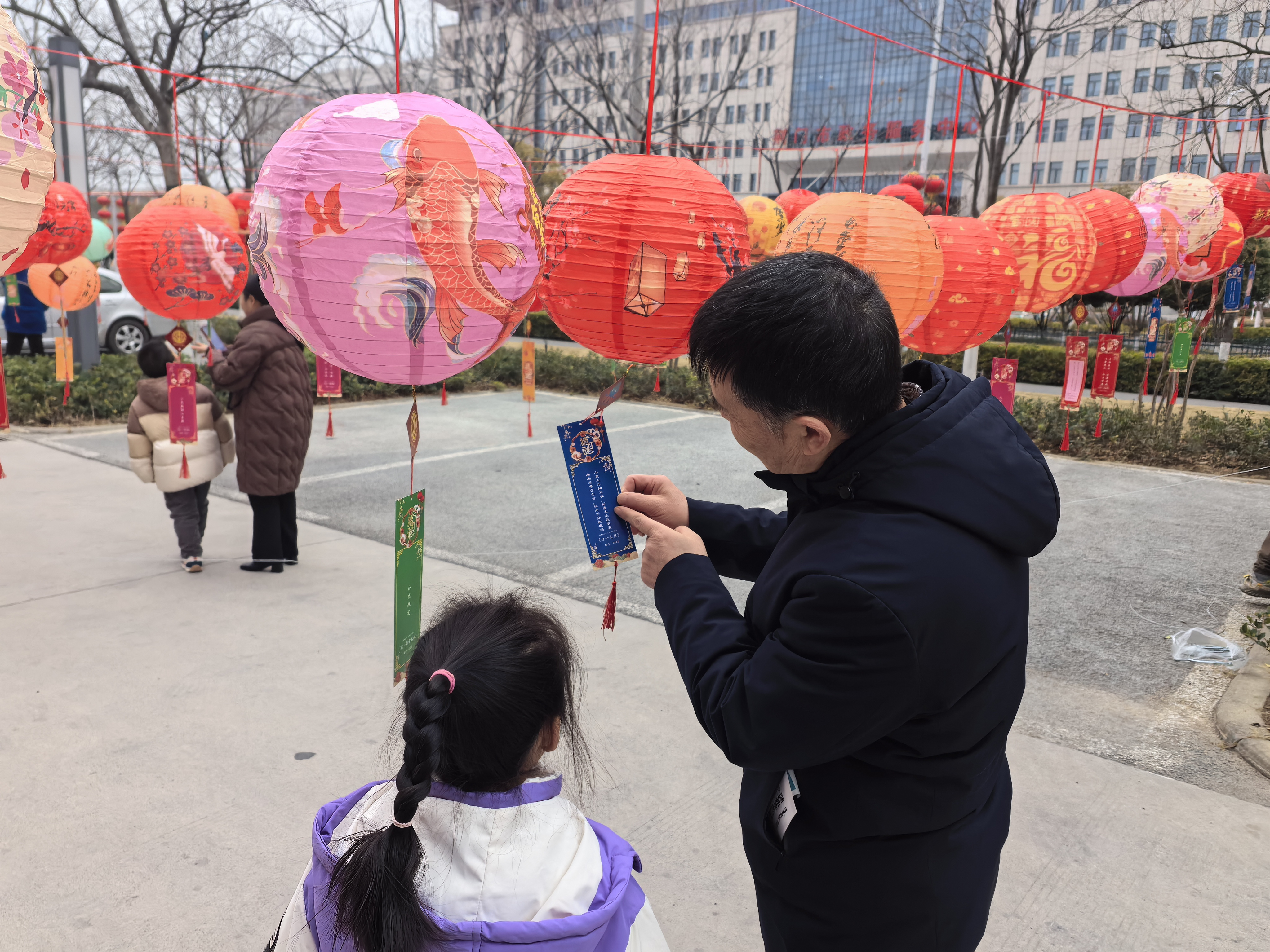 活動現(xiàn)場,燈籠高懸,五彩絢麗,宛如繁星點(diǎn)綴。每個燈籠下,精心設(shè)計(jì)的燈謎隨風(fēng)輕搖,內(nèi)容涵蓋歷史文化、生活常識、成語典故以及水務(wù)知識等多個領(lǐng)域,兼顧趣味與知識,吸引了眾多市民駐足參與。大家或低頭沉思,或相互討論,現(xiàn)場歡聲笑語不斷,洋溢著濃濃的節(jié)日氛圍。