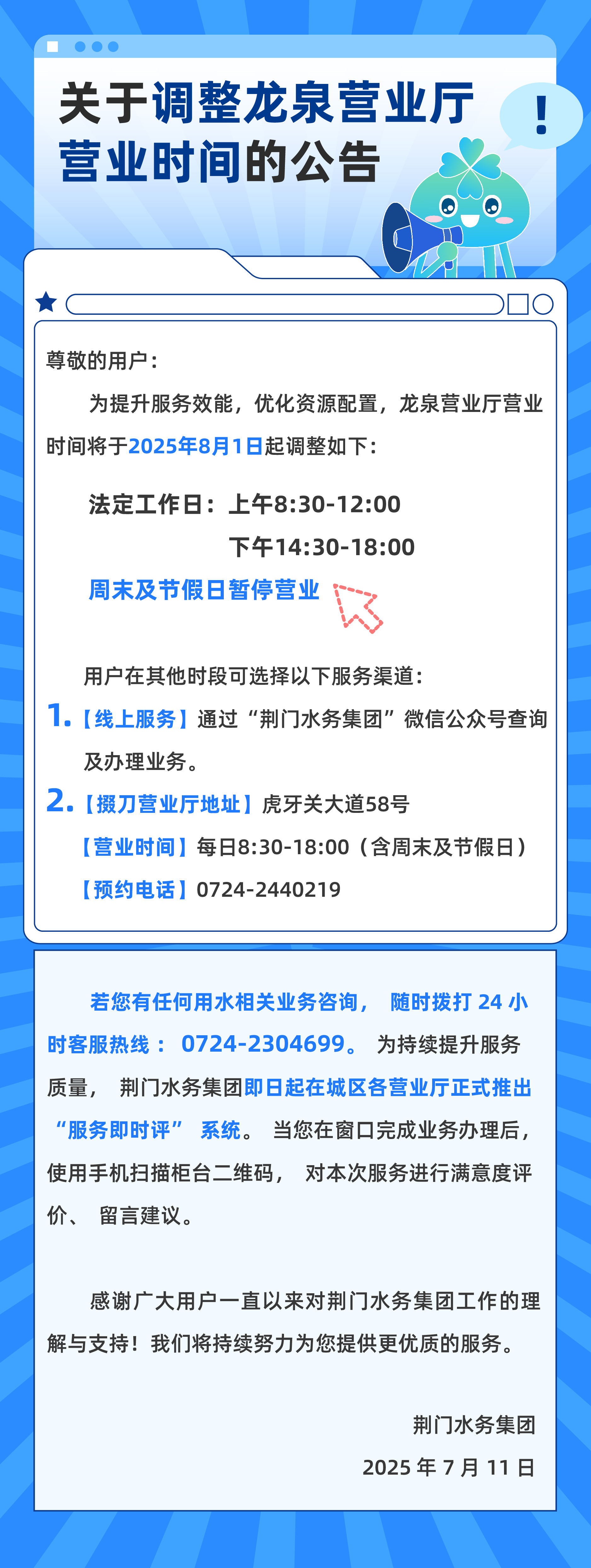 關(guān)于調(diào)整龍泉營業(yè)廳營業(yè)時間的公告