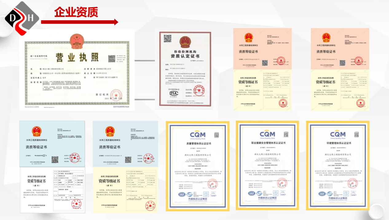 大衡公司持有湖北省市場監(jiān)督管理局評審中心頒發(fā)的CMA計(jì)量認(rèn)證證書(共340項(xiàng)參數(shù)),具有水利工程檢測資質(zhì)巖土、混凝土甲級;量測、金屬結(jié)構(gòu)和機(jī)械電氣類乙級。業(yè)務(wù)范圍涵蓋水庫除險(xiǎn)加固、灌區(qū)續(xù)建配套與節(jié)水改造、泵站更新改造、堤防工程、河道治理、農(nóng)村安全飲水、土地復(fù)核等多個(gè)領(lǐng)域,連續(xù)四年承擔(dān)湖北省水利廳水利工程飛檢任務(wù),以誠信經(jīng)營與專業(yè)服務(wù)樹立行業(yè)口碑。