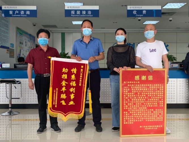 5月15日上午,荊門市金豐新材料有限公司總經(jīng)理袁家群和東寶區(qū)工商聯(lián)相關(guān)負(fù)責(zé)人來(lái)到市供水總公司,送上感謝信和寫(xiě)有“情系福利事業(yè) 助推金豐騰飛”的鮮艷錦旗,以感謝市供水總公司想企業(yè)之所想、急企業(yè)之所急,用實(shí)際行動(dòng)踐行初心使命,助推企業(yè)復(fù)工復(fù)產(chǎn)。