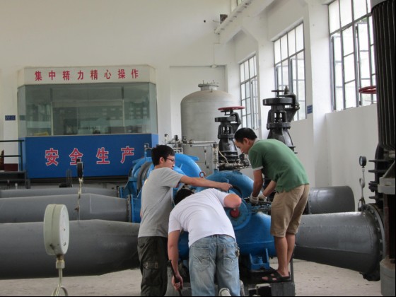 近日,氣溫逐漸攀升,為確保高峰供水時供水設(shè)備的正常運行,市供水公司加壓站組織維修人員搶前抓早、多措并舉,加強對供水設(shè)施、設(shè)備的維修保養(yǎng)。圖為加壓站維修人員在維護(hù)3#送水泵。